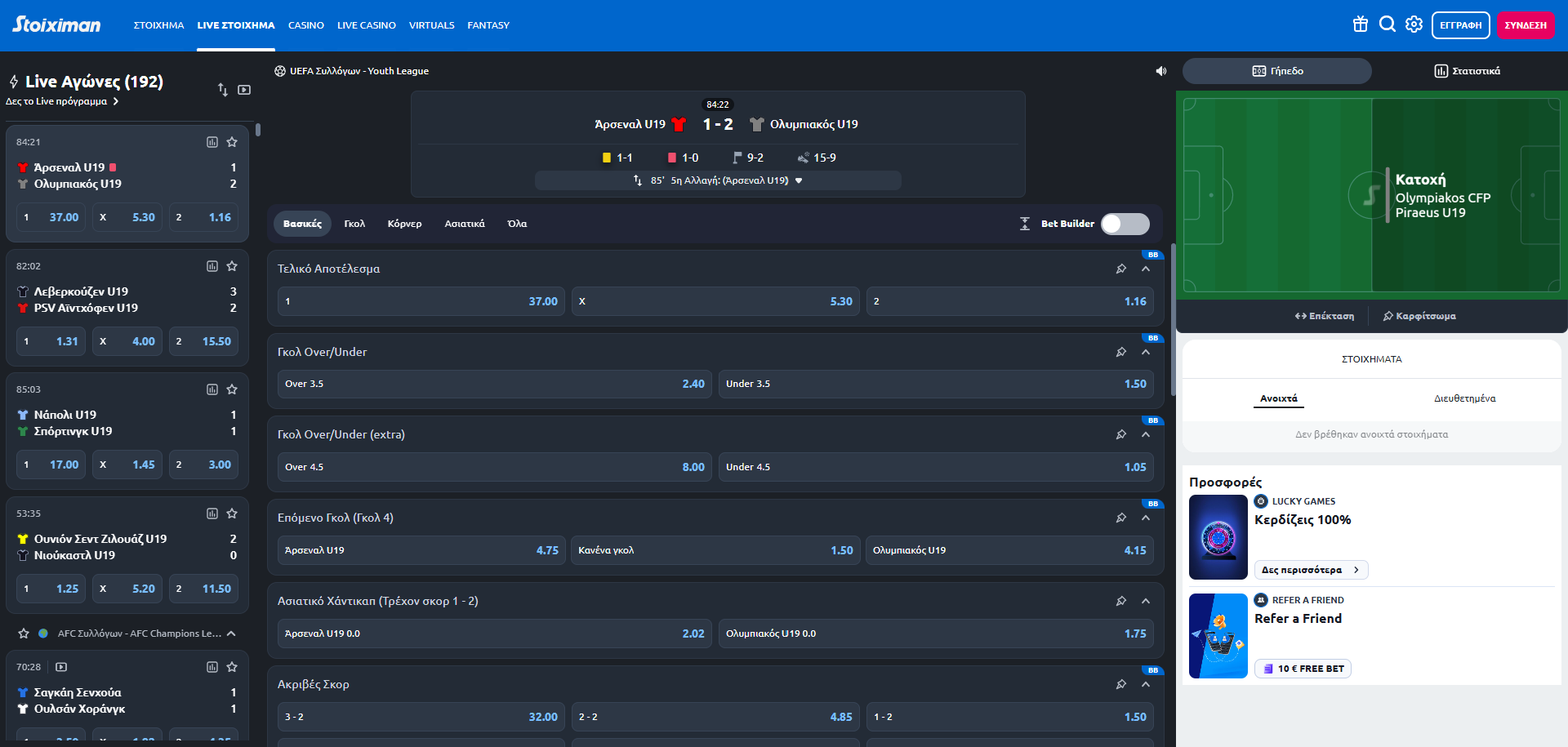 Ένα από τα μεγάλα «όπλα» της Stoiximan στο Live είναι η προσφορά Ασιατικών Χάντικαπ, ενώ επίσης θα βρείτε την κατηγορία SuperLive, όπου μπορείτε να στοιχηματίζετε ποιο γεγονός θα συμβεί μετά από συγκεκριμένες χρονικές στιγμές, όπως γκολ, πλάγιο, κόρνερ, οφσάιντ, κάρτα κ.α.
