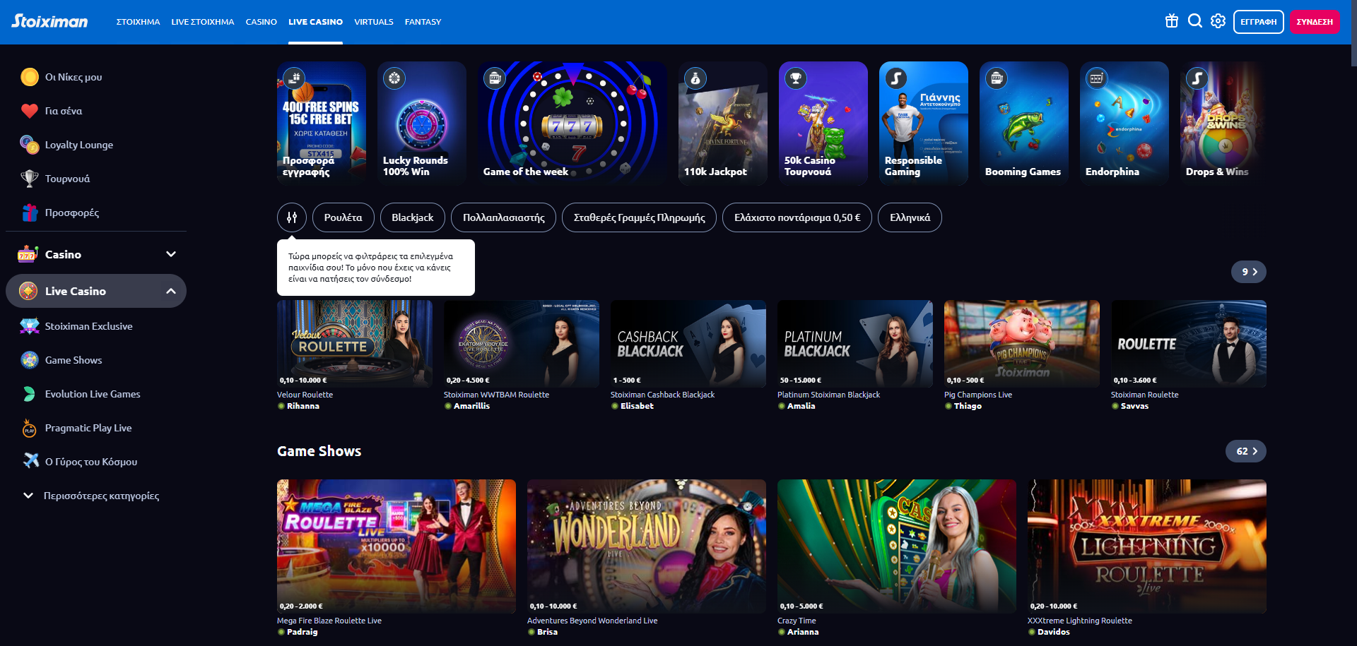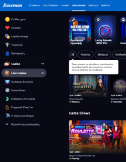 Στο Live Casino της Stoiximan, θα βρείτε εντυπωσιακά Game Shows, 400+ τραπέζια Live Casino με ρουλέτες & blackjack αλλά και κορυφαία τουρνουά συνθέτουν ένα συναρπαστικό κόσμο γεμάτο δράση στη Stoiximan που κάνει το παιχνίδι σου καλύτερο. Φυσικά, το Live Casino… μιλάει και ελληνικά με αποκλειστικά τραπέζια για τα μέλη της Stoiximan σε Live Blackjack & Live Roulette με Έλληνες dealers!